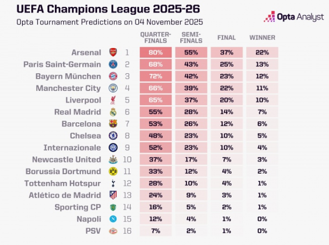 欧冠夺冠概率:阿森纳居首 巴黎第二巴萨第7
