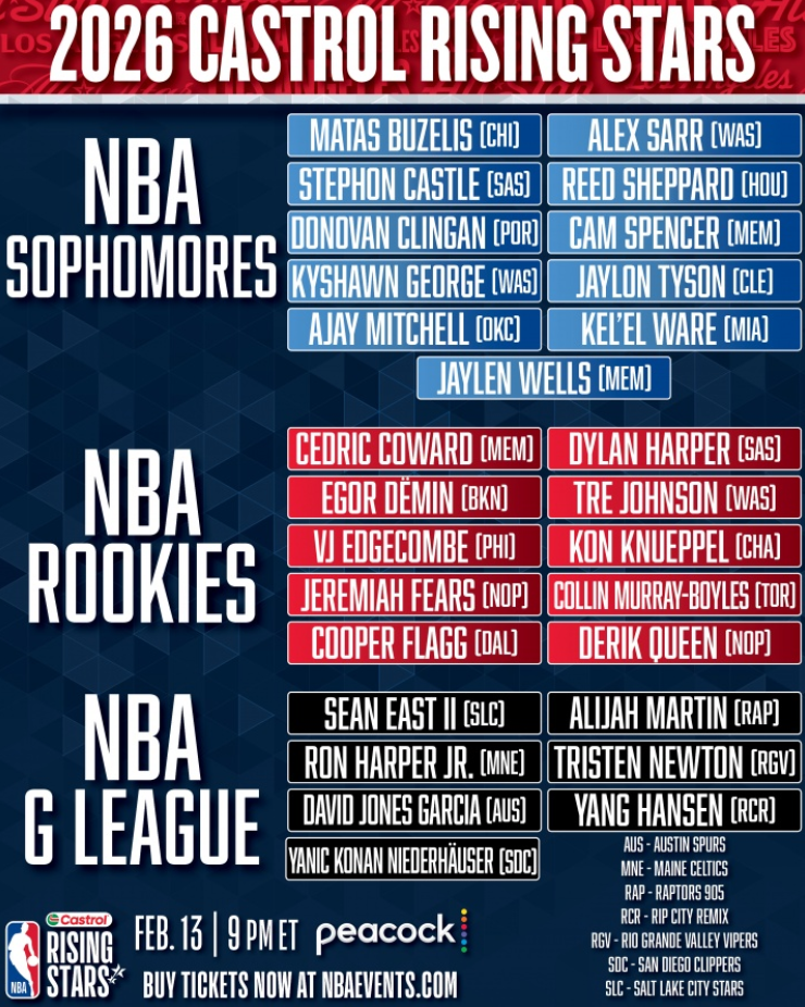 G联赛7人:杨瀚森(撕裂之城混音)、肖恩·伊斯特二世(盐湖城星)、小罗恩·哈珀(缅因凯尔特人)、大卫·琼斯·加西亚(奥斯汀马刺)、雅尼克·科南·尼德豪泽(圣迭戈快船)、阿利贾·马丁(猛龙905)、牛顿(毒蛇)。