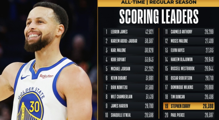 今日首分到手,库里正式超越皮尔斯,独占NBA历史得分榜第19位!