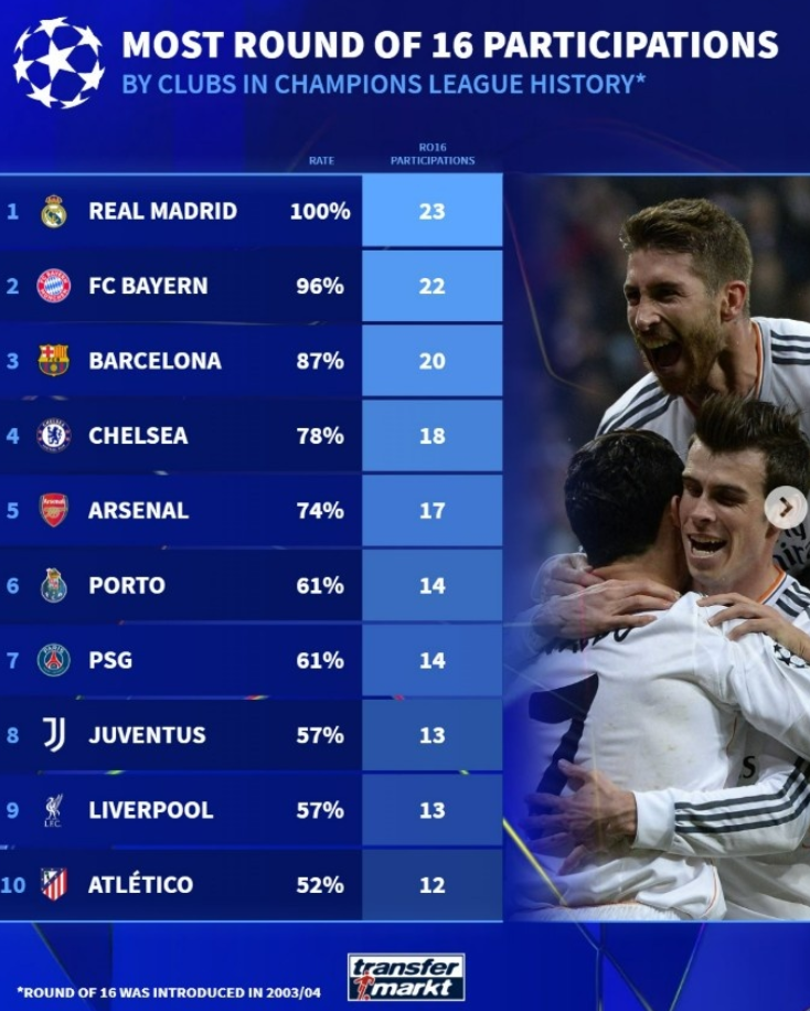 2月27日讯 本赛季欧冠淘汰赛抽签在即,德转也盘点了欧冠自03/04赛季改革赛制之后,各支球队晋级16强次数榜,具体如下(晋级成功率+次数):